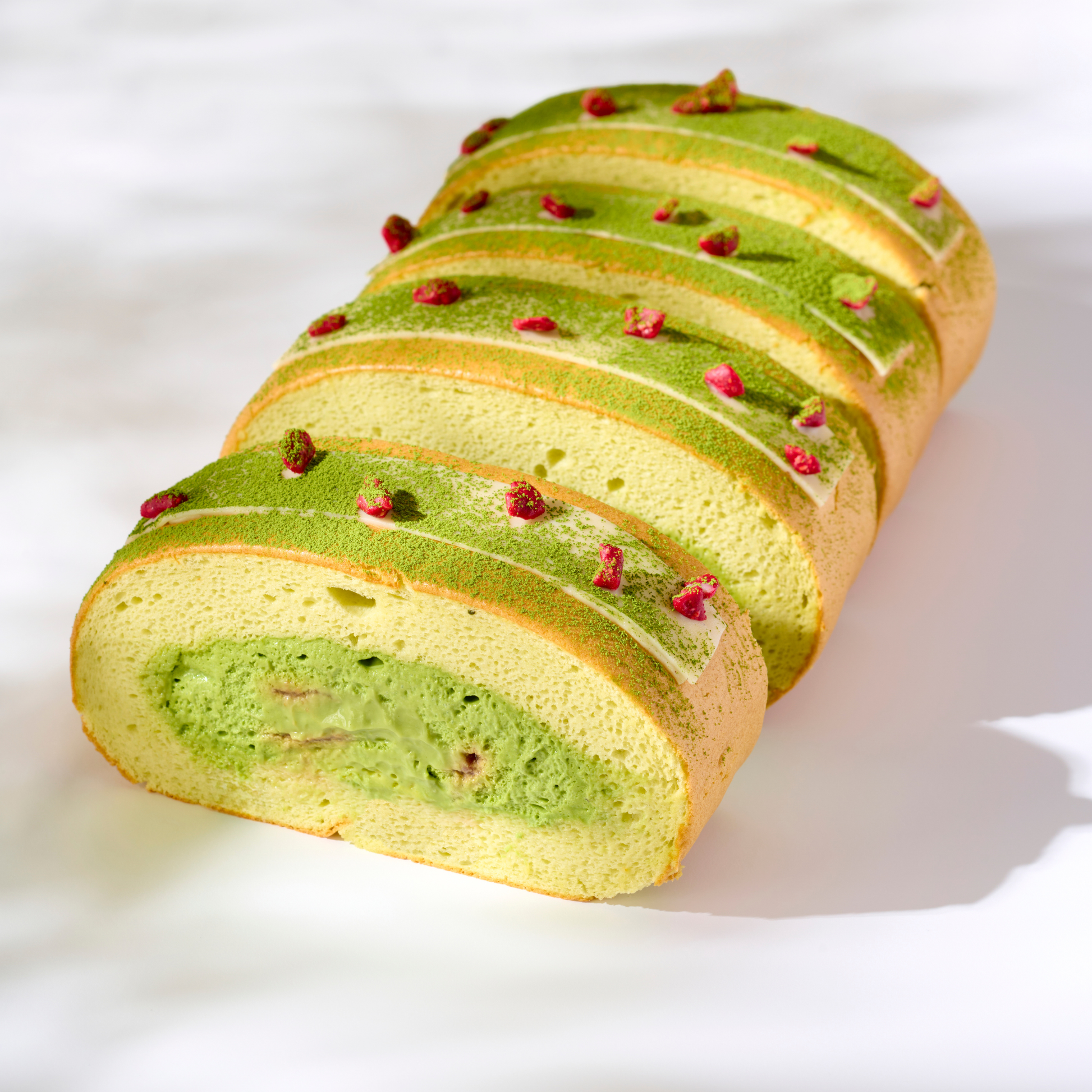 A light and airy Japanese matcha sponge roll filled with smooth matcha cream and a delicate hint of raspberry confit.