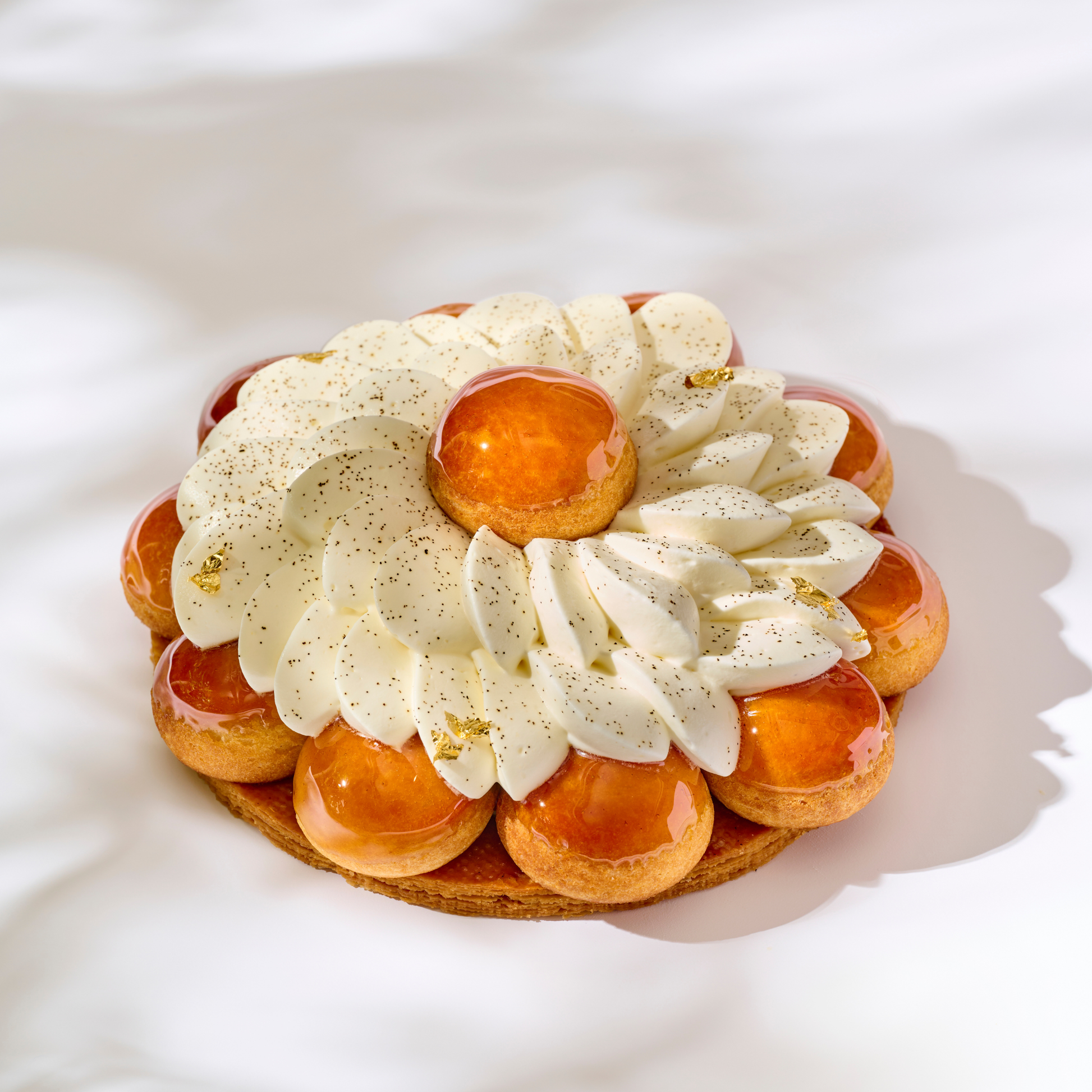 Set on a crisp puff pastry base, crowned with a ring of caramel-glazed choux puffs filled with light vanilla pastry cream. The center holds silky mascarpone-Chantilly cream, piped in graceful swirls and finished with a delicate caramel glaze — a harmonious play of crisp, creamy, airy textures in an indulgently classic composition.